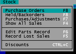 A good place to start learning our system is the Stock Enquiry Program. This is the first program on the Foxpro > Parts menu.